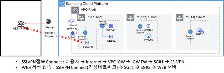 고객 네트워크와 Samsung Cloud Platform을 암호화된 가상 전용망을 통해 연결하는 서비스. SCP내 SSL VPN 상품을 사용하지 못하는 경우, 설치형으로 OpenVPN 기반의 SSL VPN 솔루션 ( MIT License)을 활용하여 SCP외부 네트워크에 있는 개발자나 운영자가 VPC 내부에 있는 VM 자원까지 접근합니다. 구성 절차 요약 Public subnet 에 NAT IP가 포함된 VM을 만들고, VPN Port 및 관리 Port 를 확인하여 VPC 와 VM 앞단의 방화벽에 정책 오픈 합니다. (표1, 표2) OpenVPN 기반의 Open 솔루션 설치 installer scripts 를 다운로드 받아 설치 및 구성을 합니다. (하기 URL 활용해 설치 및 구성) 설치가 끝나면, 이..